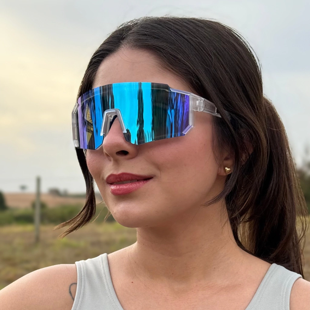 ✔ Lentes espelhadas azuladas com visual esportivo e moderno.